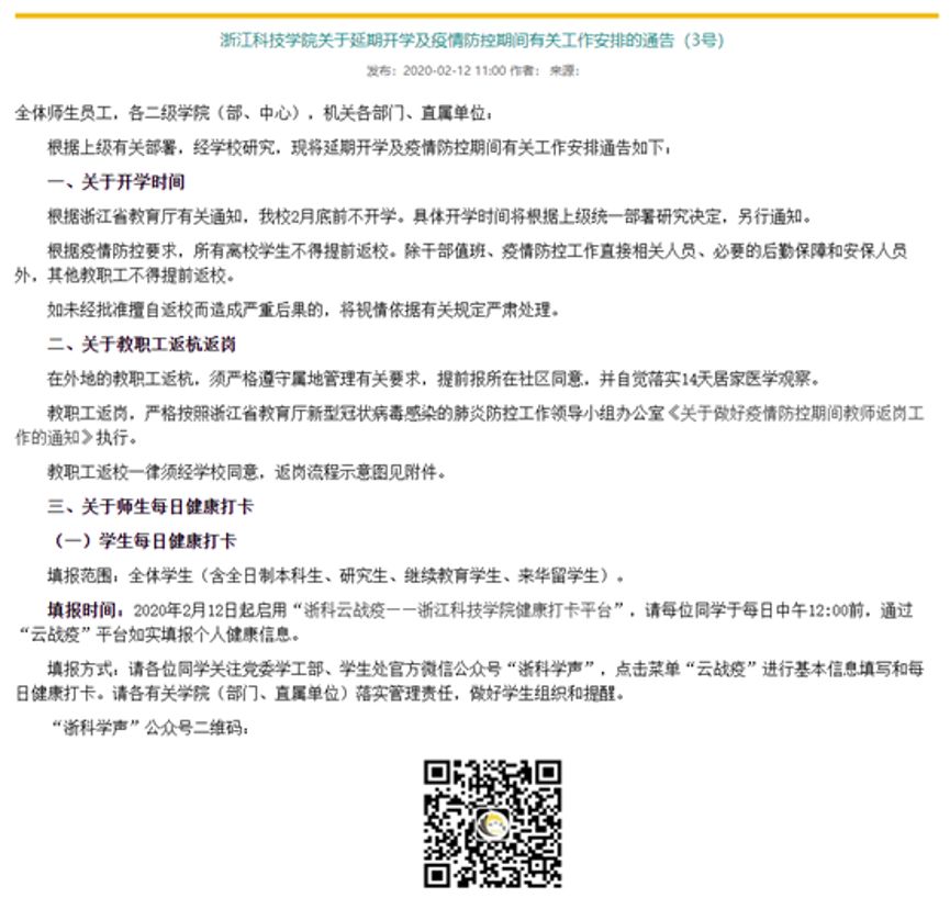 在各支部书记老师的带领下,各位党员同志学习了学校的相关文件,着重学习了浙江科技学院关于延期开学及疫情防控期间有关工作安排的通告。要重视在云战役上的每日健康打卡,主动在规定时间完成,并且遵守学校相关规定,不能提前返杭。虽然目前疫情的形式有所好转,但是我们不能有丝毫的松懈,在疫情结束之前,每一个人都不能掉以轻心。