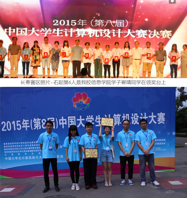 2015年(第8届)中国大学生计算机设计大赛于7月20日至8月6日,分大类分别在上海(软件应用与开发类)、西安(数字媒体设计类专业组)、成都(数字媒体设计类普通组)、长春(微课设计)各地举行,我校学子共有7件作品进入决赛并获得佳绩,其中获一等奖1项,二等奖3项,三等奖3项。