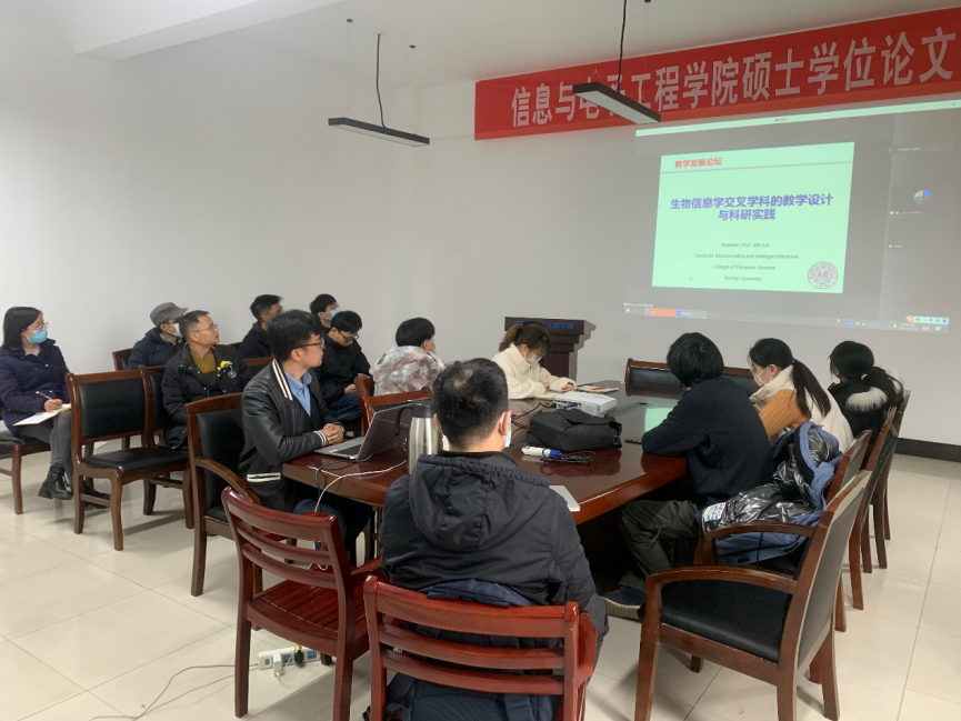 20211214日,信息学院邀请南开大学刘健教授做《生物信息学交叉学科的教学设计与科研实践》专题报告,我校信息学院与生化学院相关教师及部分学生代表参加了交流研讨。