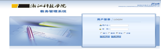 http://jwxt.zust.edu.cn/,出现登陆界面(如下图)。选择学生(默认),用户名称为:学生学号,用户口令为自己设定的密码,(如有遗忘请到所在学院教务员处查询),登陆系统。校外访问须先认证。