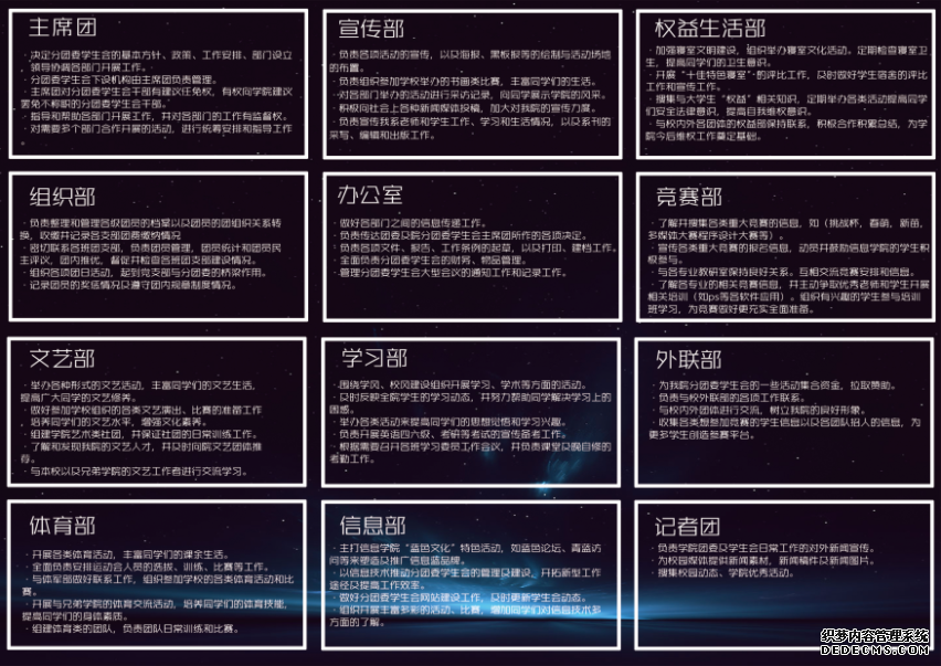 四、请各位报名的同学通过各种渠道了解学生会各部门的岗位职责和具体工作事项,便于面试和笔试。同时,在报名之后确保手机畅通,方便彼此联系。